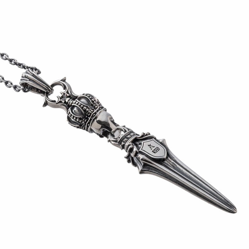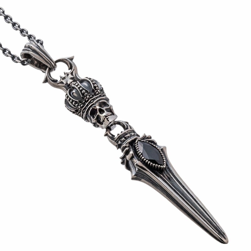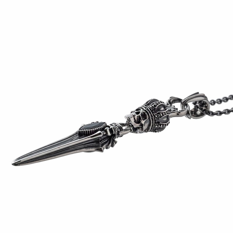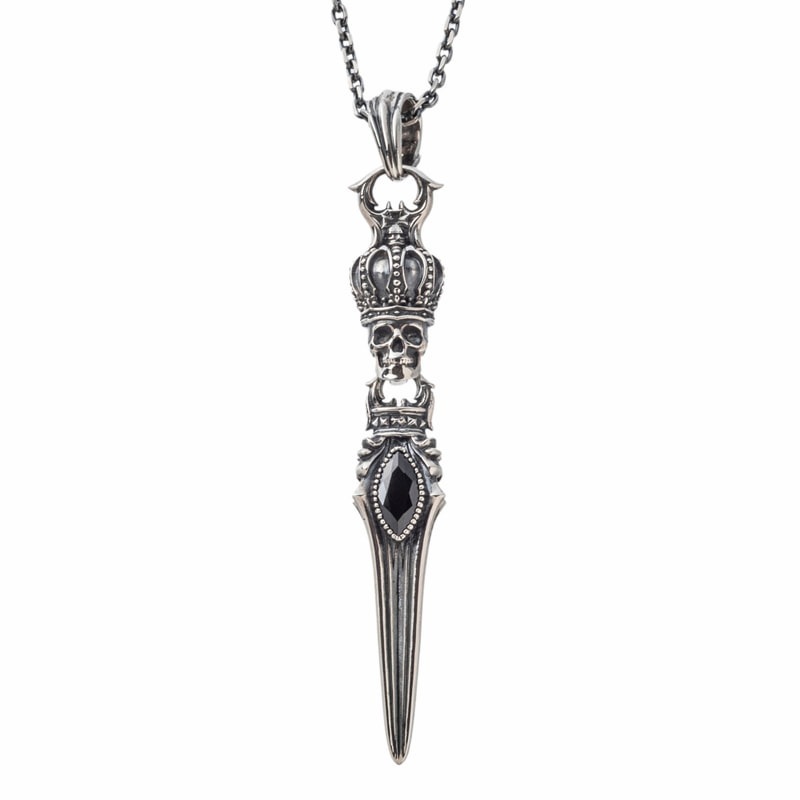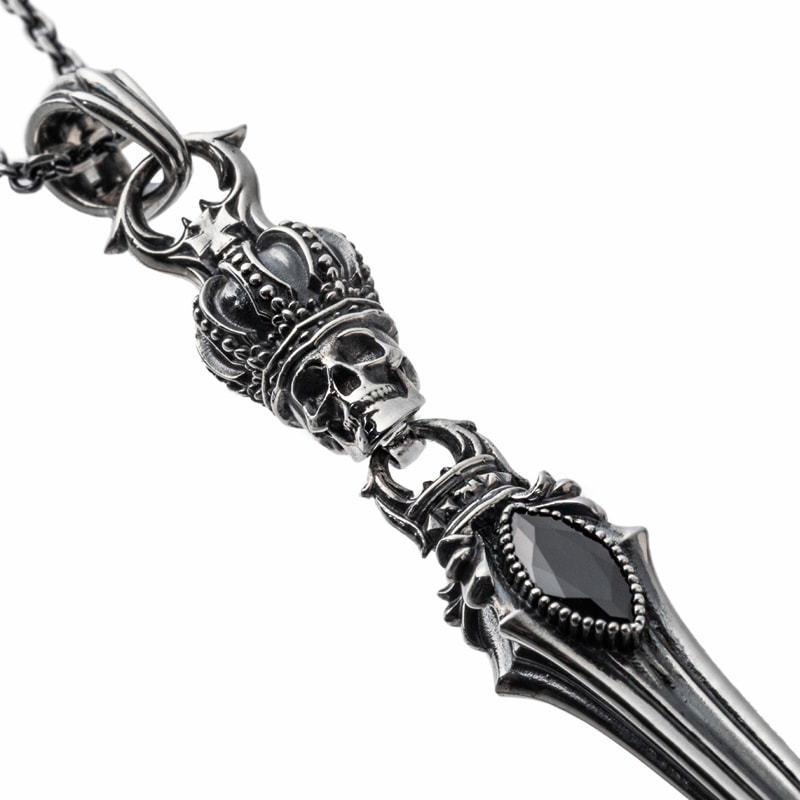 王冠をかぶったスカルから剣が連なるペンダント。細部まで作り込まれたデザインで、エッジの利いたROCKなモチーフ。石はCZブラック。スカルクラウンダガーシリーズを合わせてコーディネートもおススメ。裏にはブランドと925の品質刻印。