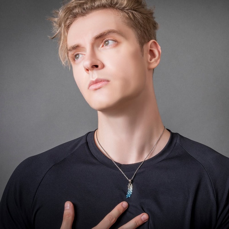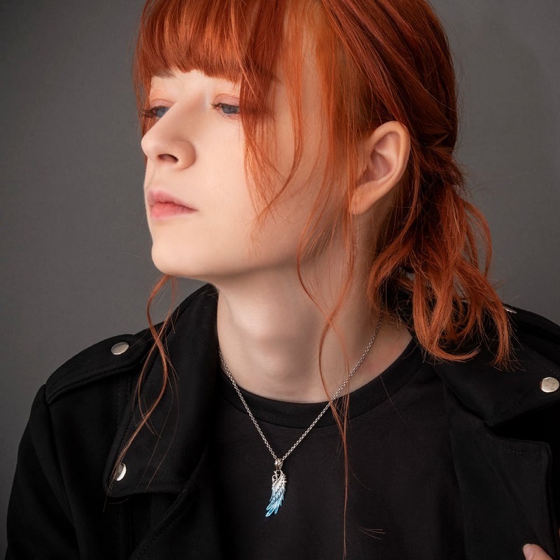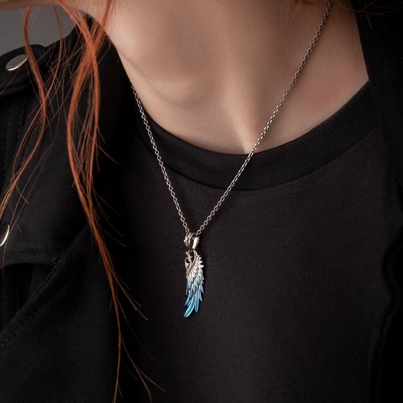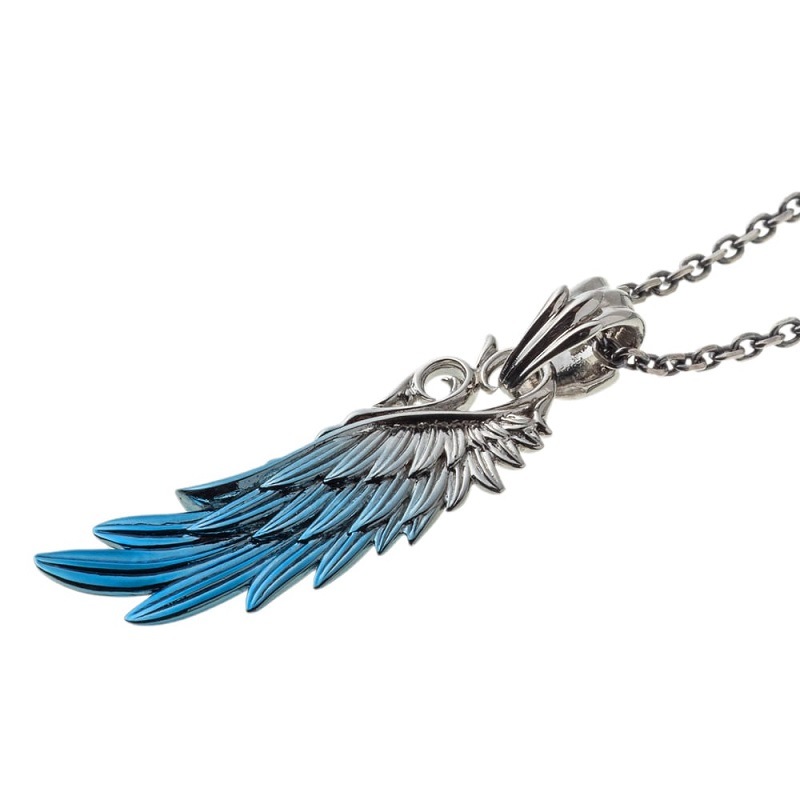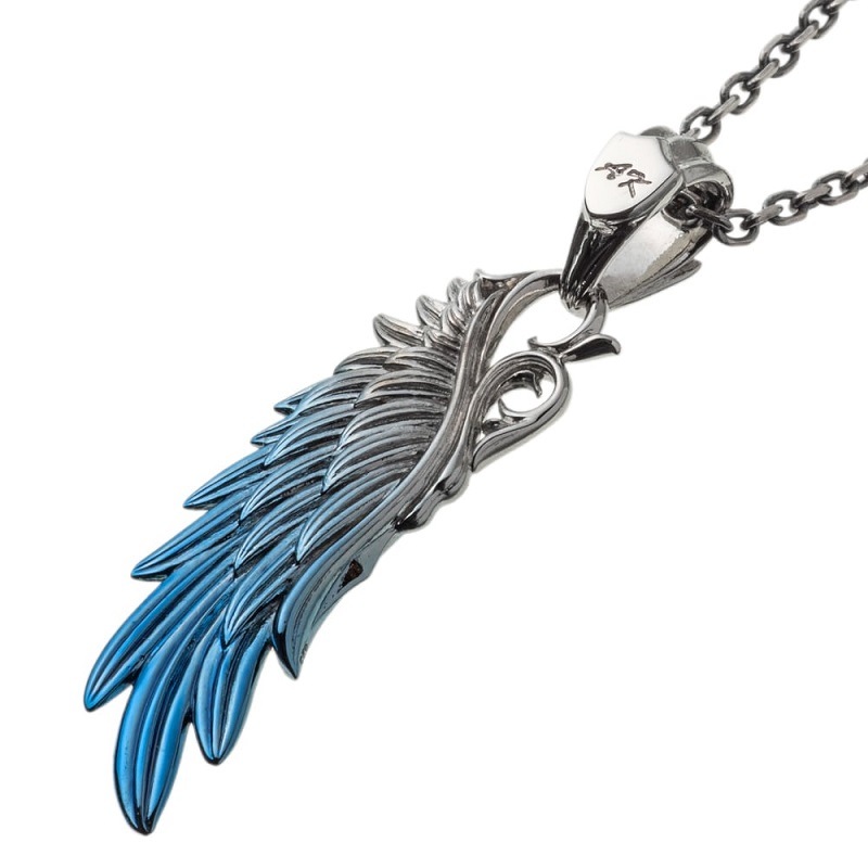 青のプレシード加工でグラデーションを施した翼モチーフのペンダント。