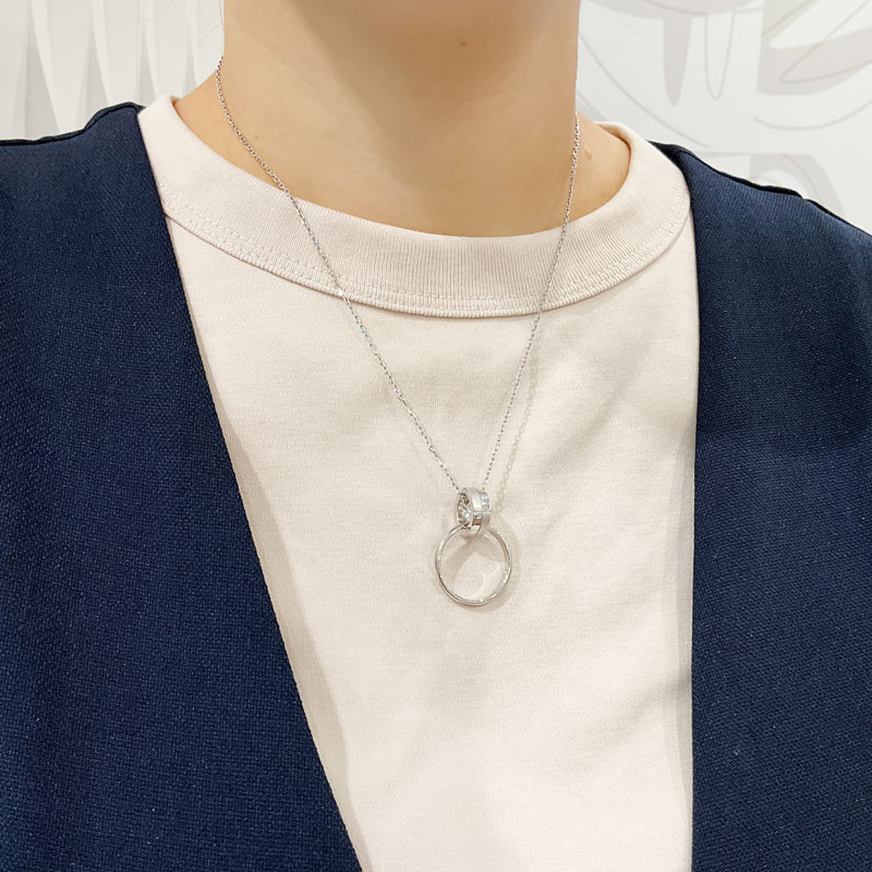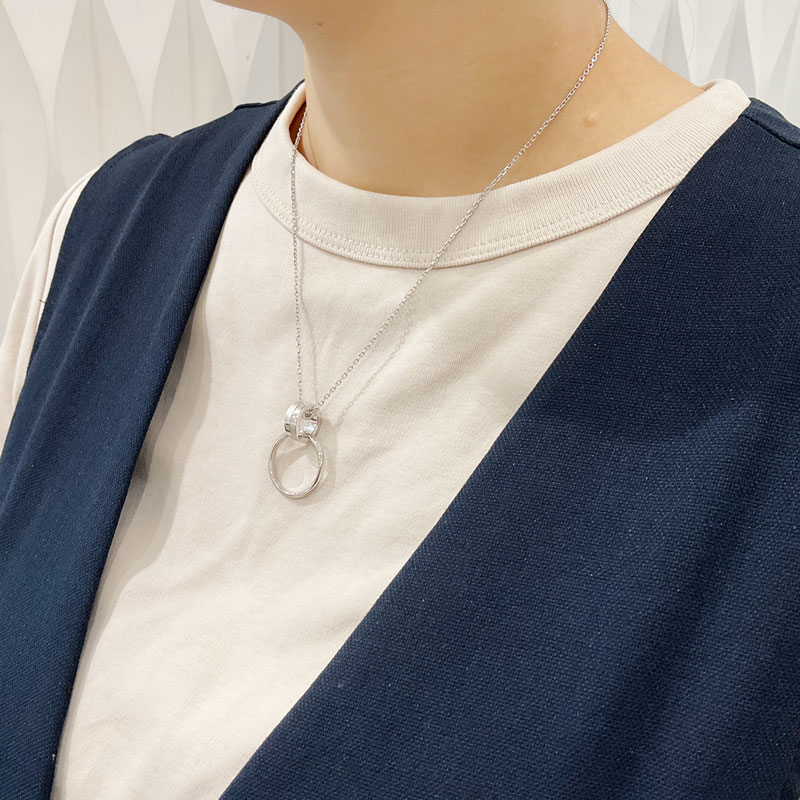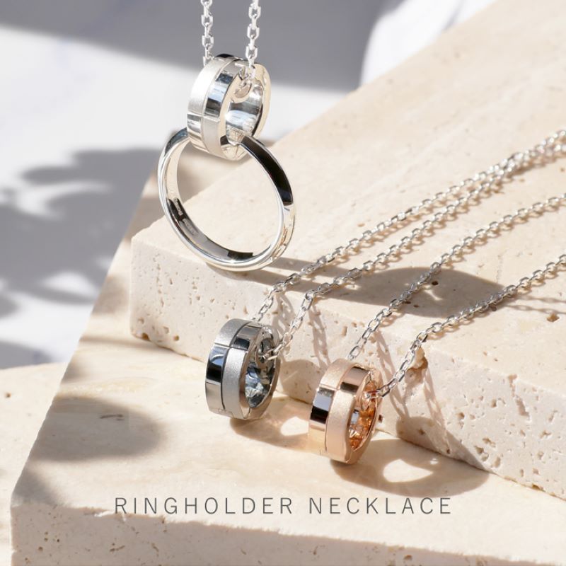 リングホルダーとしてはもちろん、リングを付けずに単品使いでリングモチーフのネックレスとしてもお使いいただける2way ネックレス。異なるテクスチャを組合せて柔らかな輝きをまとわせました。シンプルで洗練されたデザインで、男女ともにカジュアルなTシャツからシックなセーターなど、どのコーディネ―トとも相性が良くシーンを問わずご着用いただけます。