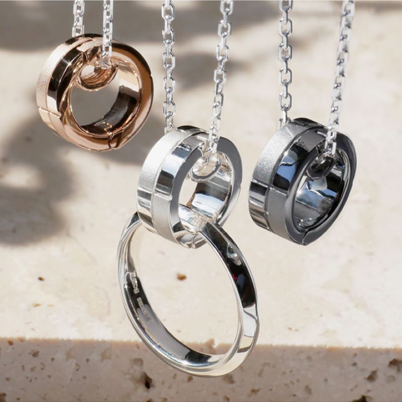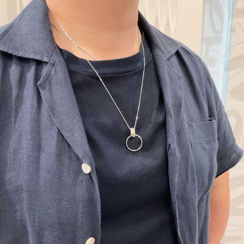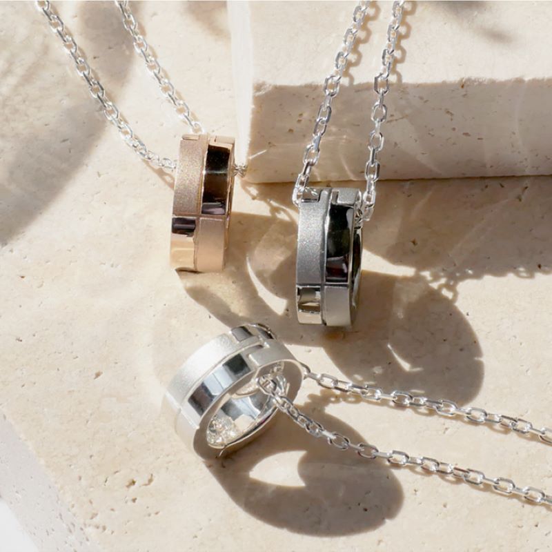 リングホルダーとしてはもちろん、リングを付けずに単品使いでリングモチーフのネックレスとしてもお使いいただける2way ネックレス。異なるテクスチャを組合せて柔らかな輝きをまとわせました。シンプルで洗練されたデザインで、男女ともにカジュアルなTシャツからシックなセーターなど、どのコーディネ―トとも相性が良くシーンを問わずご着用いただけます。