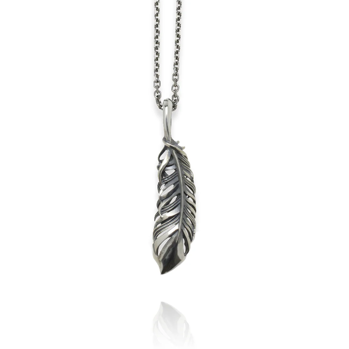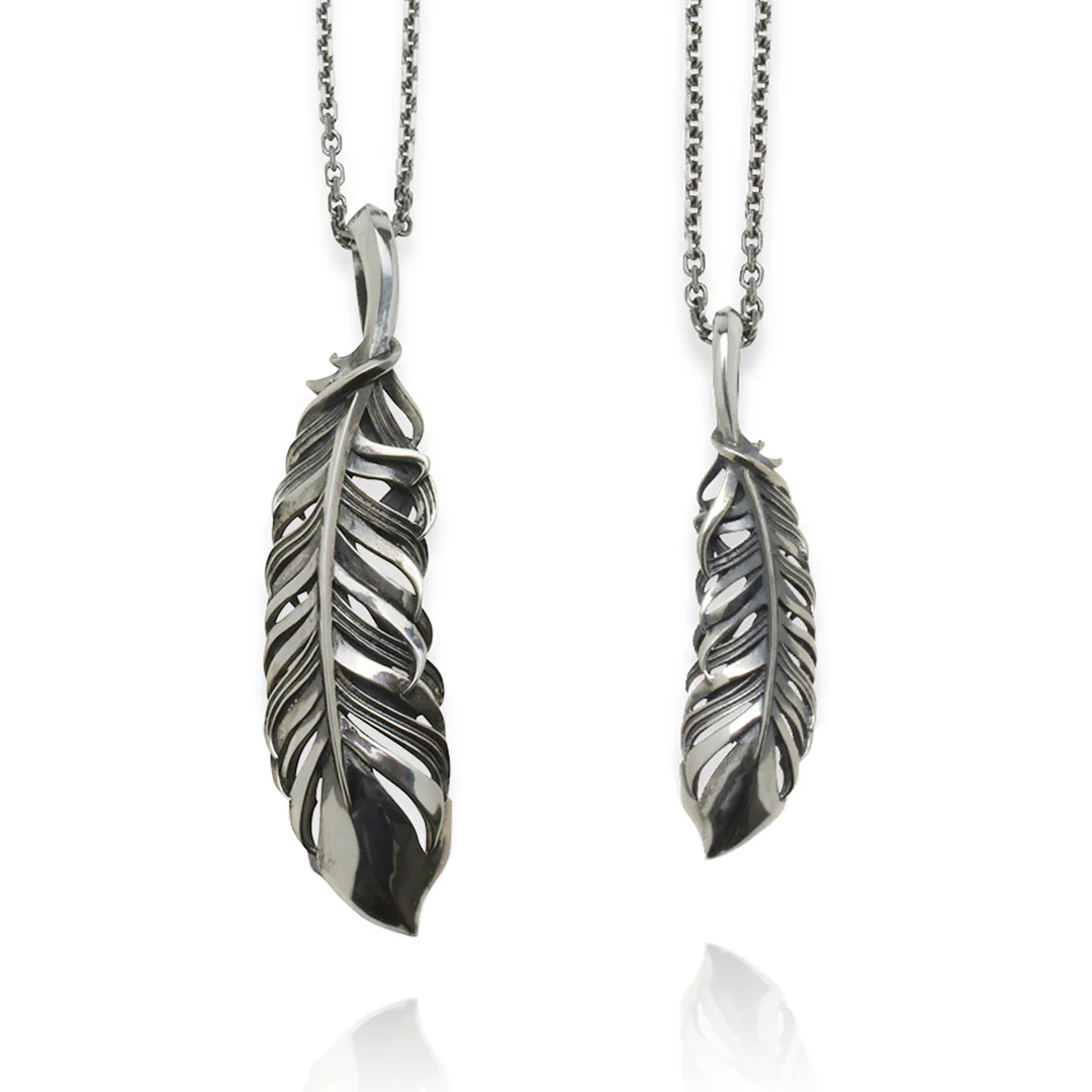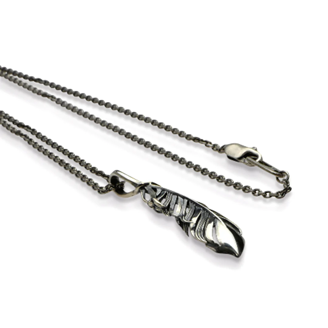 重なり合う羽毛の一枚一枚が今にも風で靡きそうなフェザーペンダント。細部のディティールにまでこだわり丁寧に作りあげられた飽きのこないデザインは他のフェザーとはまた一味違ったもの。1本だけでシンプルに着けるのは勿論、その日の気分で複数の羽を組み合わせたりと様々なスタイリングを楽しめます。
