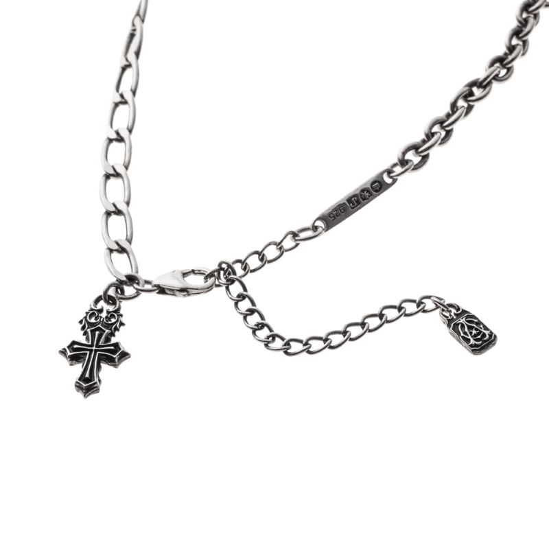 三種のチェーン(喜平・アズキ・ロング喜平)を緻密に組み上げたミックスチェーンネックレス。二か所に配したクロスチャームと、Czクリアを宿すイニシャルボールがリズムを刻み、胸元に奥行きと光のコントラストを描きます。素材はSV925。上品な艶とほどよい重みで、素肌にもニットにも映えるモダンな表情。幅と長さの差異が生むレイヤード感は、コーディネートの主役にも控えめな抜け感にも。非対称に置いたチャームのバランスが、動くたび繊細な煌めきを生み出します。鏡面の艶と陰影のコントラストを効かせ、ディテールまで美しく。プレートにはロゴとホールマーク、〈925〉の刻印入り。全長50cm、アジャスターで45–50cmに調整可能。ACモノグラムのエンドチップまで丁寧に仕上げました。ブランド監修のもと、提携アトリエの高度な技を受け、一点ごとに丁寧に完成。チョーカーやペンダントとの重ね着けも相性抜群で、ユニセックスに楽しめます。季節やスタイルを問わず、装いを洗練へ導く一作です。ギフトにも最適。日常から特別な瞬間まで、永く寄り添う確かなクオリティを実感してください。
